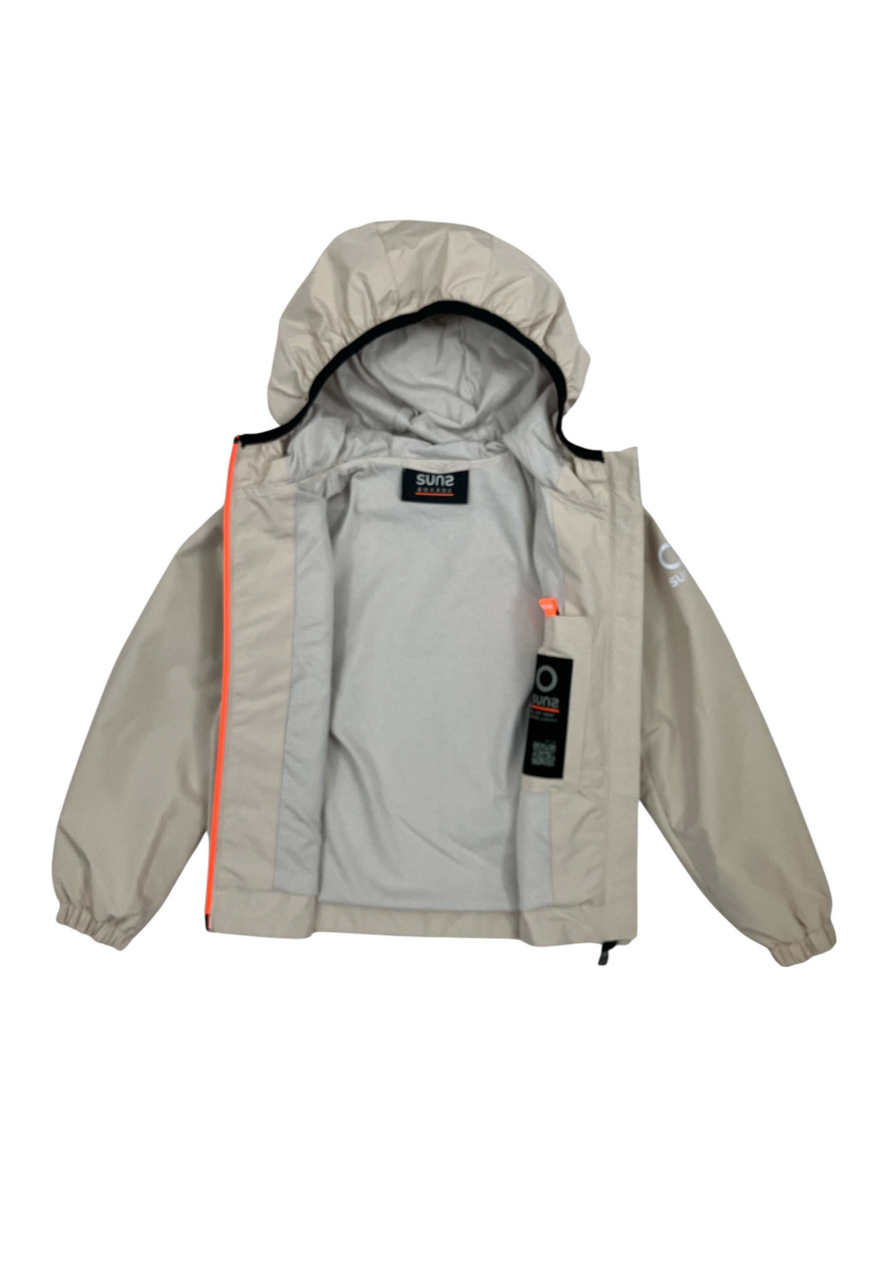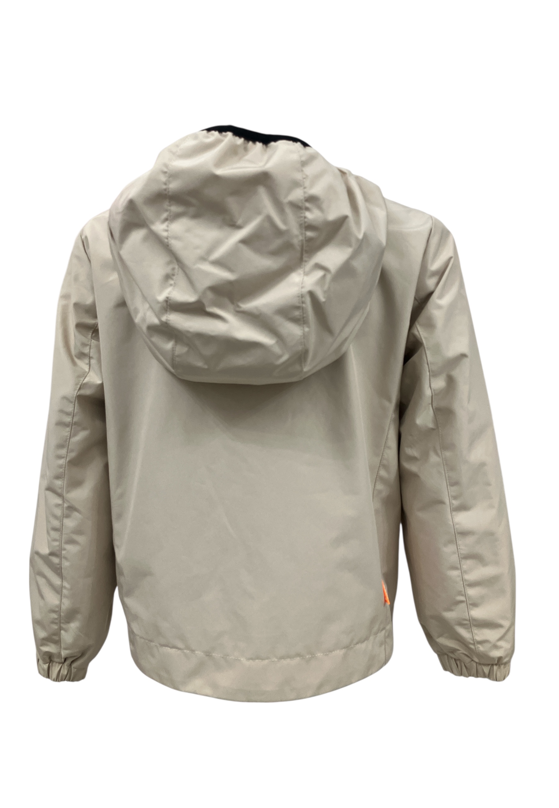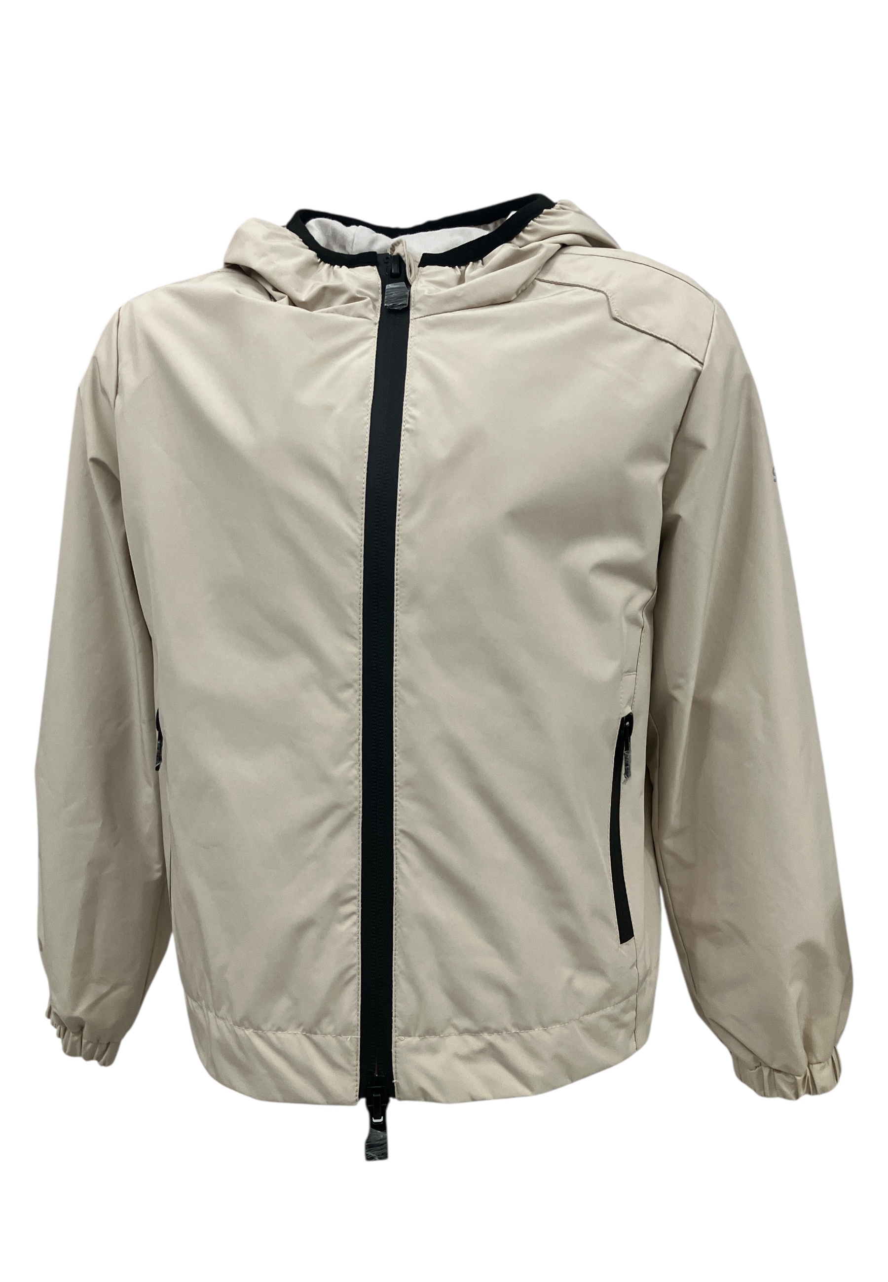 Giubbino con cappuccio, chiusura cerniera termonastrata, bidirezionale. Due tasche avanti con chiusura cerniera..
